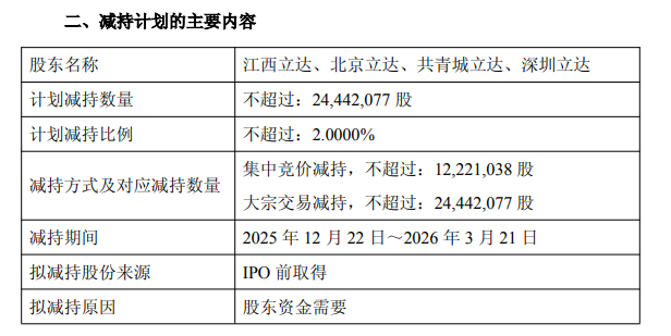 中国经济网北京12月17日电 孚能科技(688567.SH)今日公布股东减持方案。公司股东包括江西立达新材料产业创业投资中心(有限合伙)(以下简称“江西立达”)、北京立达高新技术创业投资中心(有限合伙)(以下简称“北京立达”)、共青城立达投资管理合伙企业(Limitinafter投资管理合伙企业)和深圳立达新能源与先进制造创业投资合伙企业(有限合伙企业)。深圳立达合伙企业)(以下简称“深圳立达”)合计持有公司股份45,842,644股,占公司总股本的3.7511%。江西立达、北京立达、共青城立达、深圳立达拟通过大宗交易和/或集中竞价方式减持其所持有的公司股份。总计拟减持股份数量不超过24,442,077股,拟减持股份比例合计不超过公司总股本的2.0000%。本次减持期限:采用集中竞价减持方式的,应当自公告之日起3个交易日后的3个月内进行,任意连续90个自然日内减持股份总数不得超过公司股份总数的1.0000%及12,221,001股;采用大宗交易方式减持的,应当自公告之日起3个交易日后的3个月内进行,且任意连续90个自然日内减持数量合计不得超过公司总股本的2.0000%、24,442,077股。通过本次减持,上述实体计划将其在公司的总持股比例减少至不超过2.0000%。公司总股本为24,442,077股。孚能科技实际控制人为YUWANG(王宇)和Keith D. Kepler。 YUWANG(王宇)是加拿大国民,Keith D. Kepler 是美国国民。孚能科技于2020年7月17日在上海证券交易所科创板挂牌上市,发行价格为15.90元/股。保荐机构(联席主承销商)为华泰联合证券,保荐代表人为孔祥熙、岳阳,联席主承销商为中信证券、东吴证券。孚能科技首次公开发行股票募集资金总额为340,472.96万元。扣除发行费用(不含增值税)后,募集资金净额为322,450.73万元。孚能科技最终募集资金净额比原计划减少21,231.93万元。孚能科技2020年7月10日发布的招股书显示,公司计划to raise 3,436,826,600 yuan in funds, which will be used for the annual 8GWh lithium-ion power battery project (Funeng Zhenjiang Phase III Project) and the supplementary working capital project. The total issuance cost (excluding value-added tax) of Funeng Technology's initial public offering of stocks was 180.2223 million yuan, of which the underwriting and sponsorship fee was 156.6038 million yuan. The "Response to the Approval of the Registration of Funeng Technology (Ganzhou) Co., Ltd.'s Issuance of Stocks to Specific Objects" issued by the China Securities Regulatory Commission (China Securities Regulatory Commission) Licensing [2022] No. 1472) agreed that the company will issue 140,000,000 RMB ordinary shares (A shares) at specific target issue prices of 23.70 yuan per share.募集资金总额为人民币3,318,000,000.00元。扣除发行费用后,募集资金净额为人民币3,256,480,253.05元。上述资金均已到位。 2022年11月3日,达华华会计师事务所(特殊普通合伙)出具了《孚能科技(赣州)有限公司发行1.4亿人民币普通股(A股)后实收股本的验资报告》(大华验字[2022]000757号)。经测算,孚能科技两次募资共计募集资金672,272.96万元。