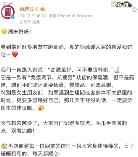 近期,“烈酒如何成为年轻女性的童话”等话题引发关注。 12月7日,金牌公司发布如下内容:周末愉快!最近看到很多朋友在谈论金酒,真的很感谢大家的喜爱和讨论~我们总是对大家说:“金酒虽然好,但是不要喝太多。”它是一种具有“免疫调节、抗疲劳”功能的保健酒,但它不是药物。喝时要适量,细嚼慢咽,不可淡饮。尤其是女性朋友,如果来月经或者身体不舒服,一定要照顾好自己。如果这几天感觉不舒服,应该听医生的建议。天气越来越冷,出门记得多穿衣服,准备好围巾、手套,以免感冒!再次感谢各位朋友的信任。祝大家身体健康,日子温暖,一切顺利每天访问!据了解,金酒含有枸杞、当归等多种中药材。在健康消费趋势的推动下,它已成为许多年轻人日常饮用的新选择。金牌相关负责人告诉积木新闻,金牌一直倡导健康饮酒、合理饮酒的理念。建议消费者根据自身实际情况考虑网络成瘾,不要盲目跟风喝酒。 (积木新闻记者 周浩)