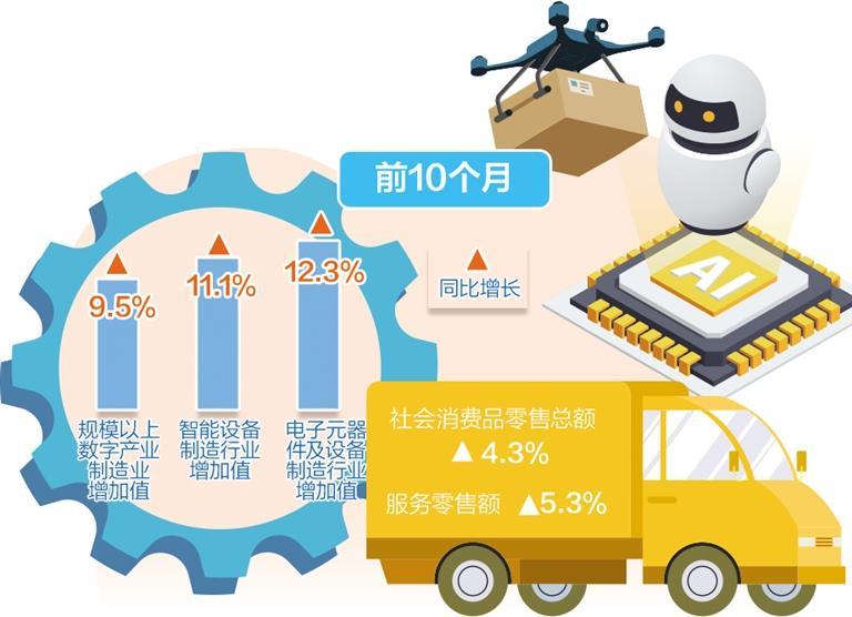 国家统计局公布的数据显示,10月份生产需求持续增长,劳动力价格总体稳定,转型升级持续推进。今年以来,面对国际环境复杂变化、外部不利影响深化、国内市场供需旺盛、物价低迷,各地区、各部门加大实施更加积极的宏观经济政策力度,深化全国统一市场建设,深化改革、扩大开放,强化发展驱动。国民经济顶住压力,保持稳中向好发展态势。 10月份经济总体平稳,生产供应继续增长。农业农业生产形势良好,全年粮食有望丰收。工业生产总体平稳。 10月份规模以上工业增加值同比增长4.9%,继续保持平稳增长。服务业增长平稳。 10月份服务业生产指数同比增长4.6%。增速较上月略有下降,主要受去年同期基数增加影响。从两年平均和累计增速看,服务业增长总体平稳。国庆、中秋假期加快相关服务业增长。 10月份住宿和餐饮业生产指数同比增长3.9%,增速比上月加快2.6个百分点。市场销量不断扩大。促进消费专项行动持续推进假日经济对经济发挥重要拉动作用,商品和服务零售额持续增长。 10月份社会消费品零售总额同比增长2.9%,贸易相关商品销售保持较快增长。居民节假日出行增多,旅游、文化等服务消费不断扩大。前10个月,服务业零售额同比增长5.3%。就业形势总体稳定。 10月份全国城镇调查失业率为5.1%,连续两个月下降。其中,全市外出务工农业登记劳动力调查失业率为4.5%,比上月下降0.2个百分点,明显低于普查失业率。就业形势总体稳定,重点群体就业持续改善,对稳增长发挥重要作用保障民生、促进发展。价格出现积极变化。 10月份,居民消费价格由降转升,剔除食品和能源的核心CPI(居民消费价格指数)同比上涨1.2%,涨幅比上月扩大0.2个百分点,连续六个月上涨。工业生产者出厂价格降幅连续三个月收窄,规范市场竞争秩序效果显现。 10月份,锂离子电池制造、光伏设备及组件制造等行业价格环比分别上涨0.2%和0.6%。 “还要看到,外部环境不稳定不确定因素较多,国内结构调整压力较大,经济平稳运行面临诸多挑战。”付令辉 新闻发言人国家统计局国民经济综合统计司司长、IEF经济学家表示,要以稳就业、稳企业、稳市场、稳预期为重点,积极推动宏观政策持续落实和发挥效益,全面深化改革开放,进一步强化创新驱动,推动经济实现有效质的提升和合理量的增长。新动能培育壮大 今年以来,我国在推动经济结构调整、加快培育新动能方面不断取得积极成效。数字经济、平台经济等新需求不断扩大,新兴产业快速发展,产业升级动力明显,有力支撑经济平稳运行。我的。市场需求不断更新和完善,新的要求不断扩大。从消费看,消费新业态、新模式、新形势不断拓展,数字化、绿色化、智能化产品消费快速增长,服务消费持续扩大。前10个月,实物商品网上零售额占社会消费品零售总额的比重为25.2%;文化体育休闲服务、旅游咨询租赁服务零售额均保持两位数增长。从投资角度看,我们聚焦重点领域和薄弱环节,扩大有效投资。高新技术领域投资快速增长。新能源、新材料、人工智能等领域投资不断扩大,投资质量和效率不断提高。从出口情况看,机电产品和高新技术产品出口产品种类不断丰富,对外贸支撑作用显着。产业升级趋势明显,先进制造业和现代服务业比重提高。制造业持续迈向中高端,装备制造业对工业生产发挥重要支撑作用。前10个月,规模以上装备制造业增加值同比增长9.5%,占规模以上工业比重为36.1%,对规模以上工业增加值增长的贡献率达到58.7%。随着服务业与先进制造业深度融合,现代服务业发展势头良好。前三季度信息交付软件和信息技术服务、租赁和商务服务业增加值总额服务业占第三产业的比重为16.3%,比上年同期提高0.8个百分点。新兴产业发展壮大,带动支撑作用进一步增强。数字经济快速发展,绿色低碳转型持续深化,人工智能赋能产业发展,数字制造、智能制造等更多产业不断壮大。前10个月,规模以上工业制造业增加值同比增长9.5%,其中智能制造装备、电子元件和装备制造业增加值分别增长11.1%和12.3%。新能源、新材料、航空航天、低空经济等发展潜力巨大。量子技术、生物制造、具身智能等前景广阔。他们预计将成为新兴未来支柱产业,有力支撑发展壮大新动能。付令辉表示,我国经济结构调整仍在进行,新旧动能回归都存在阵痛。但从未来发展看,新生产力将培育壮大,新能源将不断增长,经济高质量发展的趋势向好。实现年度目标有很多有利条件。 “从下一阶段形势看,经济运行虽然面临诸多风险挑战,但我国经济长期向好的支撑条件和大趋势没有改变。宏观经济政策不断强化,有利空间众多,新生产力培育壮大,实现全年预期目标有很多有利条件。”富丽恩辉说。从四项主要宏观经济指标来看,我国经济平稳运行的态势没有改变,稳中求进是实现全年目标的基础。经济实现快速增长,前三季度GDP同比增长5.2%,位居世界主要经济体前列。目前,工业品价格总体稳定。 10月份全国城市评论失业率继续下降,居民消费价格同比由降转升,呈现积极变化。全球国际收支通常是平衡的。前10个月,我国货物进出口总额同比增长3.6%。截至10月底,外汇储备稳定在3.3万亿美元以上。潜在需求不断释放。在各项促消费措施的影响下,花色销量持续扩大。前 10 个月,总计l 社会消费品零售总额同比增长4.3%,增速快于上年全年。旅游、文化体